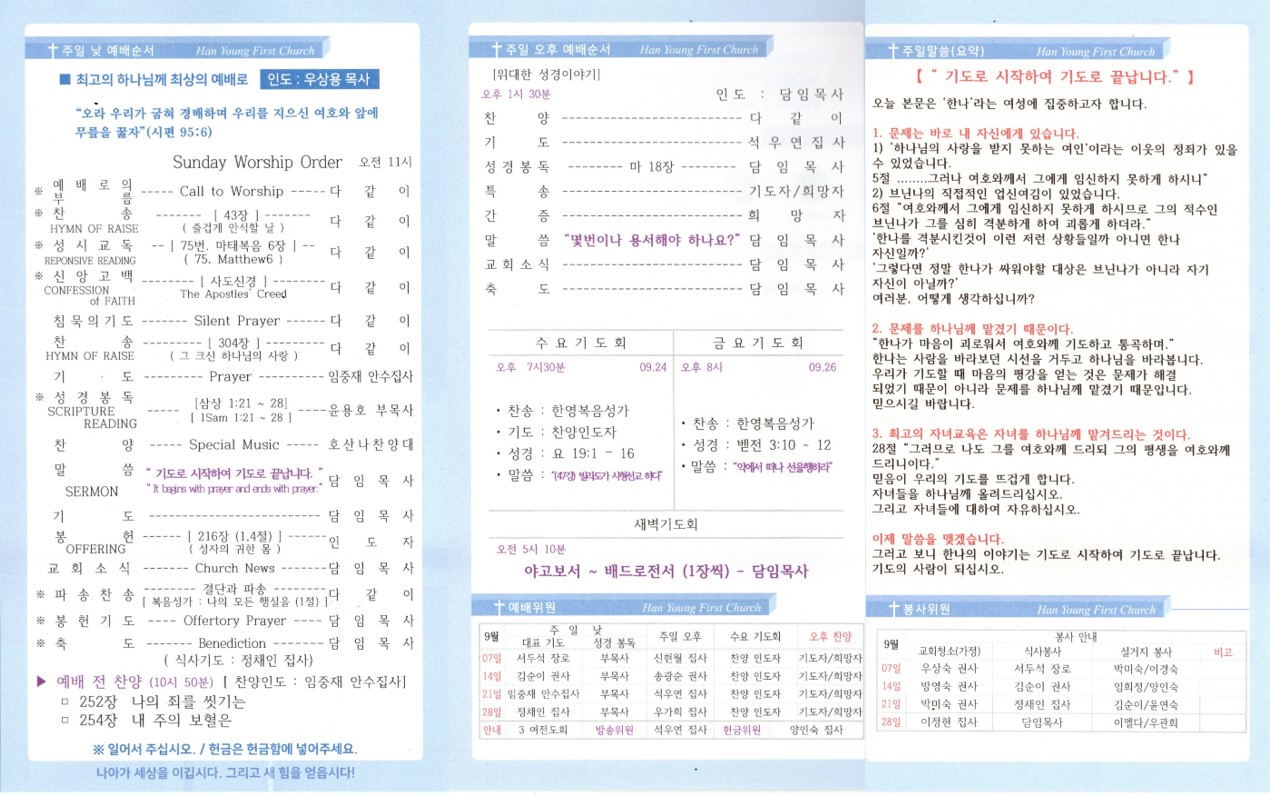한영제일교회 2025년 09월 14일 주보